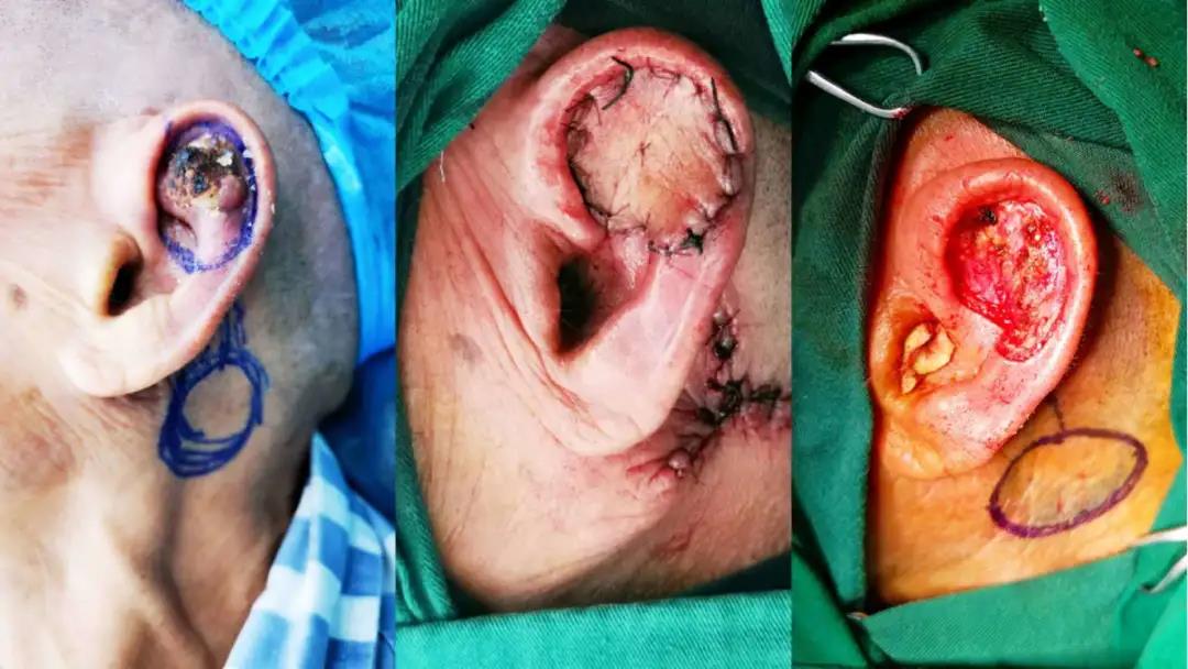 “该患者系左侧耳廓鳞状细胞癌,病变局限,分化程度高,即恶性程度低,耳周与颈部区域淋巴结无转移,适合于彻底切除原发病变,同时进行皮瓣修复,以保持原有的容貌。”经过头颈外科团队、眩晕中心岳俊生教授和耳科张朝梅主任的会诊。最终,由李红教授亲自操刀,为患者进行了耳廓原位癌变的彻底切除加带蒂皮瓣修复。