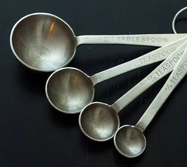 自己配置盐水也行,因为咽喉不像鼻腔那么娇嫩,用食盐是没有问题的。热水冷凉之后,一杯水(240ml),加1/4-1/2茶匙盐(下图中最小的那两个),如果有茶匙,那就加2g左右盐就可以了。
